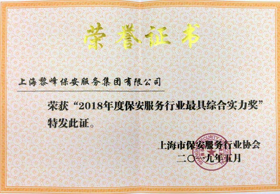 2018年10月 榮獲上海市公安局頒發(fā)的“保安服務(wù)行業(yè)綜合實力企業(yè)獎”